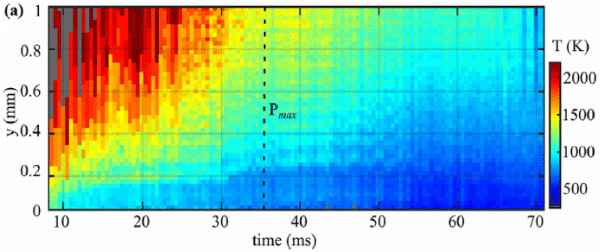 Heat loss at gas/wall interfaces plays an important role for the design of cleaner combustion engines, particularly for small engine geometries intended for hybrid-electric platforms. The accuracy with which transient heat losses can be predicted at walls is determined by the ability to resolve the thermal boundary layer. The work of David Escofet-Martin et al. takes advantage of hybrid rotational coherent anti-Stokes Raman spectroscopy (HRCARS) to measure single-shot, wall-normal gas temperatures, which provide exclusive access to the thermal boundary layer. HRCARS is combined with thermographic phosphors for simultaneous gas and wall temperature measurements. With this, we are able to record the time-history of important boundary layer quantities and wall heat flux during three types of transient event: polytropic compression, flame-wall interaction, and post-flame cooling.