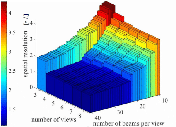 A new paper from the Edinburgh Agile Tomography group shows how to design Chemical Species Tomography systems to achieve a target spatial resolution (δ). The numbers of beams and projections (“views”) are optimised whilst minimising the total number of beams, for which there is no useful theoretical guidance. A large number of beam arrangements were simulated, as realistically as possible, in the context of in-cylinder imaging for diesel engines, and δ calculated using our previously published method. The figure here shows how δ varies as the beam array is changed: there is very little benefit of having more than about 4 or 5 views, or 20-25 beams per view. Using a “phantom” comprising real engine spray images obtained by Planar Laser-Induced Fluorescence, a 4x25 array was found to perform better than arrays 3x34 and 5x20, offering δ values of 3 mm or less for an 80 mm-diameter cylinder bore.