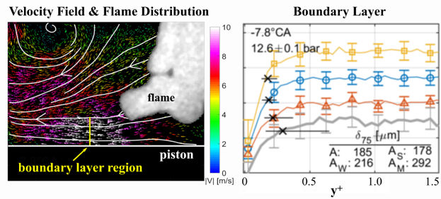 High-efficiency low-CO2 vehicles will soon be powered by down-sized IC engines operating at higher pressures. These concepts raise challenges such as transient heat transfer and flame quenching near surfaces. In a new ERC-funded project, Brian Peterson focuses on the development of laser diagnostics to study transient boundary layer phenomena relevant to engine environments. Using a unique combination of high-speed SO2 laser-induced fluorescence (LIF) and particle tracking velocimetry (PTV), measurements in an optically accessible engine reveal the transient boundary layer development in response to an approaching flame front (left figure). A strong interdependence is observed between near-wall flow and flame development, which appears to influence subsequent combustion. An approaching flame results in flow acceleration, which decreases the boundary layer thickness δ75, as shown in the right figure. These subtle effects increase convective heat loss and influence reaction rates near walls, with major impact on engine performance.