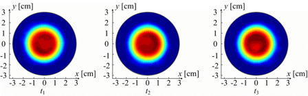 Swirl combustion is critically important for operation of gas-turbine aero engines, but the dynamic flame chemistry has not previously been accessible with spatio-temporal resolution. Using Chemical Species Tomography (CST) of combustion-produced water, Chang Liu has overcome this barrier and discovered the elegant behaviour of the flame. The three still images here show the temperature distribution of the water at 12 ms intervals. The swirling precession of the most intense flame region, which is easily visible as an anti-clockwise rotation in the images, is found to be highly stable. The movie shows the dynamics of lean blow-out (LBO) as the fuel supply rate is reduced. Measurements such as these could be used to detect swirl flame instabilities so that fuel supply can be modified actively to prevent LBO. This work is an example of the on-going collaboration between the Edinburgh group and Prof. Lijun Xu’s group at Beihang University, Beijing.